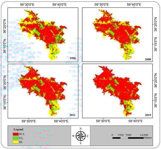 LU/LC maps of Mashhad for 1990 (top left), 2000 (top right), 2011 (bottom left), and 2019 (bottom right) with three distinguished LU/LC classes, namely, built-up land (BUL), vegetated land (VL), and bare land (BL).