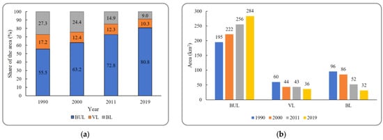 In the study, four points in time separated by approximately a decade (1990, 2000, 2011, and 2019) were used to visualize the spatial dynamics of the LU/LC. In Figure 4, the maps of the LU/LC classification of Mashhad are shown for mentioned years, while, in Figure 5, the area and the share of the area occupied by each of the analyzed LU/LC classes are presented for the same years. Over 30 years, the built-up land (BUL) had an uptrend of about 30 km2 per decade, and its area changed from 195 km2 in 1990 to 284 km2 in 2019. Vegetated land (VL) decreased from 60 km2 in 1990 to 44 km2 in 2000, while, in the period from 2000 to 2011, its area almost did not change (decreased by less than 1 km2). The downtrend appeared again between 2011 and 2019, and the VL area had decreased by 7 km2 to 36 km2. BL had a steady downward trend, with the BL area declining from 96 km2 in 1990 to 32 km2 in 2019. In almost all periods, the share of BL was higher than that of VL. The more severe decline in VL area in the period 1990–2000 than for the other periods led to the highest difference between the share of VL and BL (12%) in 2000. However, the development of Mashhad city in the period 2000–2019 consisting of building mostly on bare land, while replacing the vegetated areas with built-up land in rare cases, only led to a narrowing of the difference between BL and VL. In 2019, the share of BL was even lower than that of VL (Figure 5), while BUL had the highest share of the area in the whole studied period (1990–2019), reaching over 80%.