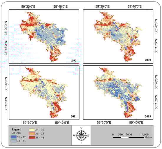 LST maps of Mashhad city for 1990 (top left), 2000 (top right), 2011 (bottom left), and 2019 (bottom right).