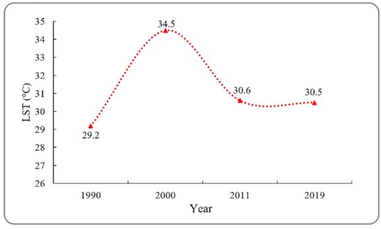 In Figure 6,the spatial patterns of the LST for the city of Mashhad during the selected timepoints from a period of 30 years (1990–2019) are presented, while, in Figure 7, the mean value of the LST for Mashhad city for the same years are shown. In the year 2000, the highest increase in LST was observed, with an average LST of 34.5 °C (change by more than 5 °C from 29.2 °C in the period 1990–2000). The upward trend was then reversed with a steep slope from 34.5 °C in 2000 to 30.6 °C in 2011 and almost no change in the mean LST in the period 2011–2019 (from 30.6 °C to 30.5 °C). The highest mean LST in 2000 was probably connected to the highest growth in the population of the Mashhad city and the highest population annual growth rate in the corresponding period (1996–2006). This led to the uncontrolled development of the city, during which a most severe decrease occurred in VL (by 16 km2, representing 4.8% of the total city area) in the preceding period (1990–2000), along with an increase in the share of BUL by 7.7% of the total area and a less noticeable decrease in BL (by 2.9%), which led to the highest difference between the shares of VL and BL (12%), as shown in Figure 5. By comparing the spatial patterns shown in Figure 4 and Figure 6, it can be deduced that, in the study area, the highest values of LST were observed for BL, whereas the lowest were observed for VL. Therefore, the high reduction in VL in the period 1990–2000 led to a higher LST in 2000. In 2011, despite a 9.6% increase in BUL, a 9.5% decrease in BL, and a very minor change in VL (0.1%) compared to the previous period (2000), a decrease in the mean LST could be observed. Similarly for 2019, despite an 8% increase in BUL, a 2% decrease in VL, and a 5.9% decrease in BL, compared to the previous period (2011), the mean LST almost did not change and was equal to 30.5 °C (Figure 7). The observed reduction in LST was probably connected to the more controlled and planned development of the Mashhad city in the period 2000–2019, consisting of building mostly on bare land, while replacing the vegetated areas with built-up land in rare cases only, which resulted in the VL, unlike previous years, occupying a larger area than BL2019. A high reduction in the hottest LU/LC type (BL), along with an almost unchanged or minor decrease in the share of VL, probably caused the effect of LST stabilization at the 30.5 °C level.