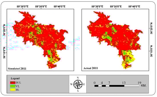 The simulated (left panel) and actual (right panel) Mashhad city LU/LC maps for 2011.