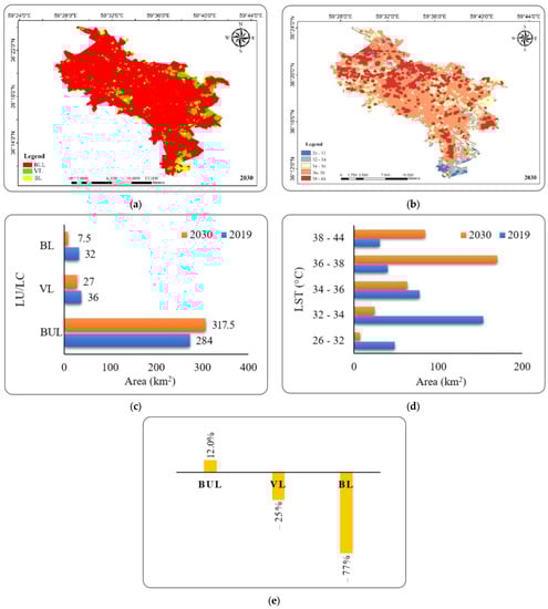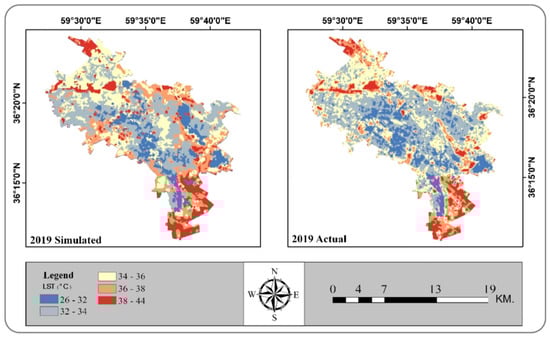 To validate the developed model and ensure its suitability, the simulated LU/LC and LST should be firstly compared to the real data. To do so, the data obtained from the satellite images for 2011 and 2019 were compared to the Markov model prediction of the LU/LC and LST for 2011 and 2019. In the paper, only the results of the LU/LC comparison obtained for 2011 (Figure 8 and Table 6) and LST comparison for 2019 (Figure 9 and Table 7) are presented. The results were compared to real values using the 2 test [90].