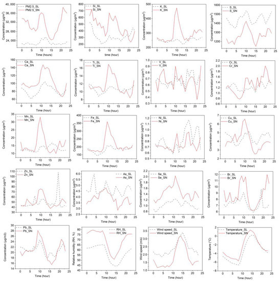 Hourly variations in concentrations of PM2.5, elements, and meteorological parameters in Seoul (SL) and Seosan (SN) during winter.