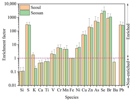 Emissions from anthropogenic sources must be drastically reduced to the greatest extent practicable in comparison to emissions from natural sources. More important information for risk management can be obtained around the sampling site from a thorough assessment of the risk levels of metals from anthropogenic sources than from that of metals from natural sources (Figure 2). If the calculated values of EF for a certain element are close to unity, it means that crustal dust is the predominant source [67,102]. On the other hand, EFs greater than 10 suggest a considerable contribution from anthropogenic sources [67,74,103]. At both the Seoul and Seosan sites, S, Cu, Zn, As, Se, Br, and Pb were identified as anthropogenic elements with EF values greater than 10 (Figure 2). In a previous study conducted in Seoul, Si, Ti, and Fe were suggested as having crustal origins, while S, Zn, and Pb were suggested as anthropogenic elements using EF calculations [39].