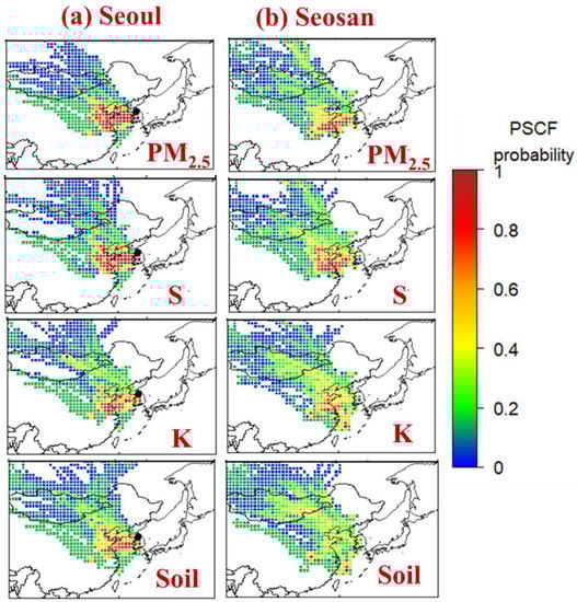 Potential source contribution function values for PM2.5, S, K, and soil throughout the study period in (a) Seoul and (b) Seosan, South Korea, during winter.