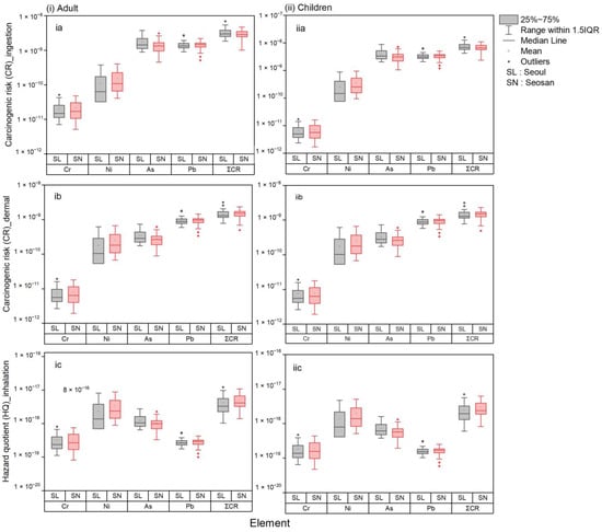 The non-carcinogenic potential health risks due to elements (Pb, Cr, Cu, V, Mn, Ni, Zn, and As) through various exposure pathways (i.e., dermal contact, ingestion, and inhalation) at the Seoul and Seosan sites were estimated via the HQ (Table 4). In Seoul, the HQ values for adults were 1.6 × 10−5, 8.5 × 10−5, and 3.2 × 10−12, while those for children were 1.5 × 10−4, 3.3 × 10−4, and 7.4 × 10−12, through ingestion, dermal, and inhalation contact, respectively. In Seosan, the HQ values for adults were 1.4 × 10−5, 8.4 × 10−5, and 3.8 × 10−12, while those for children were 1.3 × 10−4, 3.3 × 10−4, and 8.8 × 10−12, through ingestion, dermal contact, and inhalation, respectively. At both sites, the HQ values associated with As, Cr, Pb, Ni Cu, Zn, and Mn were primarily attributed to dermal contact in adults (8.46 × 10−5) and children (3.35 × 10−4). Moreover, at both sites, the dermal exposure to Cr had the highest estimated HQ values for both adults (3.67 × 10−5) and children (1.45 × 10−4) (Table 4). The estimated HQ values were higher for children than for adults at both locations for all exposure routes (Table 4).