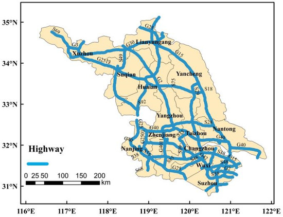 The study area is Jiangsu Province (166°18′–121°57′ E and 30°45′–35°20′ N), which is located in the eastern part of the Jianghuai Plain along the coast of mainland China and in the mid-latitude zone along the east coast of the Asian continent. This region is in the climate transition zone between the subtropical and warm temperate zones and is characterized by the East Asian monsoon climate. However, it is influenced both by the westerlies in the middle latitudes and the easterlies in subtropical and low latitudes, thus causing a variety of meteorological disasters. There is a network of more than 50 highways (approximately 5000 km in total) in Jiangsu Province, as shown in Figure 1, which suffers from low-visibility weather more and more frequently in recent years. Traffic blockage due to fog and other low-visibility conditions has occurred repeatedly. Therefore, the road safety problems caused by low visibility have received close attention from all sectors of society [34].