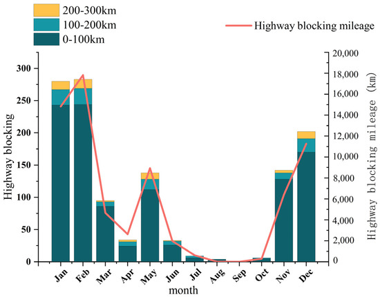 As shown in Figure 3, the proportions of annual highway blockage events that led to blockage mileage less than 100 km, between 100–200 km, and 200–300 km are 85.5, 9.8, and 4.7%, respectively. The blockage events with maximum cumulative mileage and frequency on the highways of Jiangsu Province in 2020 basically occurred in January and February, while the minimum values were observed in August and September, when there was 0 km of cumulative blockage and 0 events were reported. The frequency of blockage was higher in January, February, May, November, and December, when the mileage of individual blockage was also higher. The number of blockage events in May shows a second peak, which is different from the decreasing trend observed in March–April.