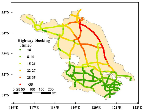 The spatial distribution of highway blockage events in Jiangsu Province in 2020 (Figure 4) shows high occurrence in the north and low occurrence in the south. For the northern Jiangsu Province, the number of highway-blocking events in the eastern part is also substantially higher than that in the western part. It can be seen form Figure 4 that, as on the major north–south highways along the eastern coast and in the central region of Jiangsu Province, there are severe highway-blocking events in the north sections of the G15 Shenhai Highway and the G2 Beijing–Shanghai Highway. Among them, there are more than 37 blockage events in the K760–K1163 section of the G15 Highway, making this section one of the most severely blocked sections.