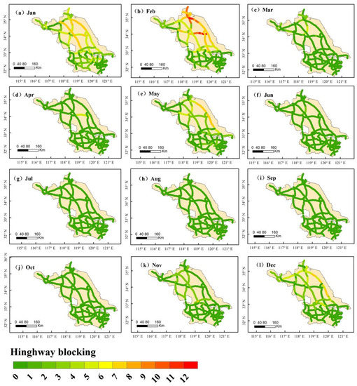 Annual variation of highway blockage distribution in Jiangsu Province in 2020.