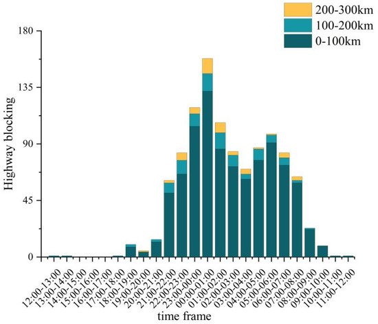 As seen from the diurnal variation of the highway blockage frequency in Jiangsu Province in 2020 (Figure 6), highway-blocking events are mainly concentrated in the late night and early morning hours. The number of blockages reached the peak value between 00:00 and 01:00 Beijing time (BT) with the value of 158. From 00:00 to 04:00 BT, there was a decreasing trend in the frequency of highway blockages, and increased between 04:00 and 05:00 BT, reaching the second highest value of 135. The trend then decreased until 09:00 BT, with almost no blockage events from 10:00–21:00 BT. The number of blockage events started to increase after 21:00 BT and reached 130 at 23:00 BT. During the late night and early morning hours, there was a greater number of events with blockage mileage over 200 km, as longer and more severe blockage events were common during this period.