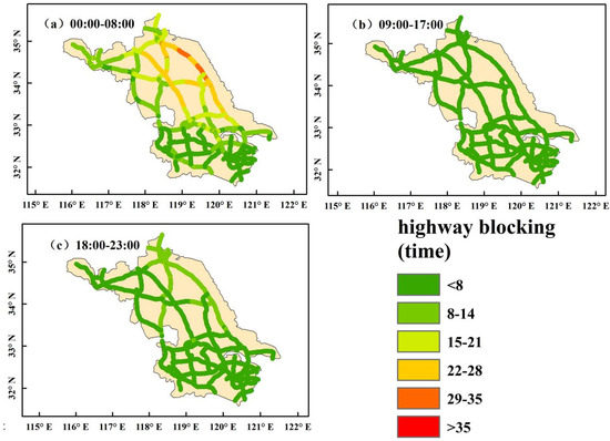 The spatial distributions of highway-blocking events during different time periods in Jiangsu Province in 2020 are shown in Figure 7. It shows that the highway-blocking events in Jiangsu Province are mainly concentrated between 00:00 and 08:00 BT. In general, the number of events in the north is higher than that in the south, and more events occur along the coast than inland. The overall trend shows the characteristic of decreasing from the eastern coast to the west, with the most highway-blocking events on the eastern coast and in the K888–K1004 section of the G15 Shenhai Highway. The section K744–K955 in the G2 Beijing–Shanghai Highway also has more highway-blocking events than average. During the period of 09:00–17:00 BT, the number of highway blockages in the entire province was relatively low; only the K765–K1098 section of the G15 Shenhai Highway and the K40–K140 section of the S18 Yanhuai Highway in the eastern coastal area had more than eight blockage events. There was an obvious increase in the number of highway blockages in the K0–K90 section of the G30 Lianhuo Highway in Lianyungang and the K1840–K1933 section of the G25 Changshen Highway in Huaiyin from 18:00–23:00 BT compared to the those during the period of 09:00–17:00 BT, showing an overall increasing trend from the inland to the eastern coastal area from 18:00–23:00 BT.