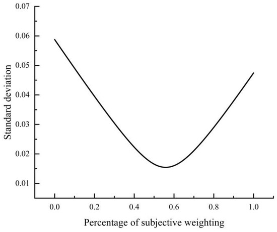 According to the indicator system in Table 2, the relative weights of the indicators corresponding to each fuzzy consistent judgment matrix were calculated using the characteristic root method to obtain the subjective weight. By unitizing the highway network data, the weight was calculated using the CRITIC method. The optimal weight allocation coefficients were determined to be those with the minimum standard deviation calculated using Equations (11) and (12). The results are shown in Figure 8, and the final weight assignment was obtained using Equation (13). The final weights are shown in Table 3.