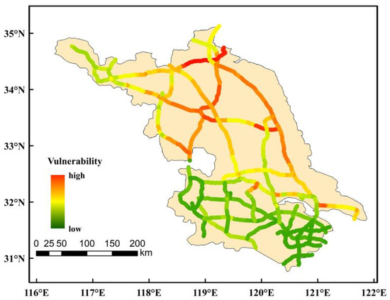 First, each vulnerability index in Table 3 was calculated in a standardized way. Then, each vulnerability index of each road network unit was calculated. The final evaluation value was obtained according to W, and the evaluation results was matched to the highway network through GIS technology, as shown in Figure 9. It is obvious that the sensitivity of highway network in Jiangsu Province to low-visibility weather presents a decreasing trend from north to south. The vulnerability of highway network is higher in coastal areas and lower in southern Jiangsu. It is worth noting that the frequency of highway blockage in Nantong City is low, but the vulnerability is high, indicating poor capacity of disaster relief in this section. The S49 Suyang highway section in central Jiangsu is highly sensitive. Combined with the analysis of blockage events, the rescue response time of this section is relatively high. The high vulnerability of G30 Lianhuo Highway in Lianyungang City is mainly due to the high severity of a single highway-blocking event. For the highways in coastal areas, although the frequency of highway-blocking events is higher, the cumulative severity of highway blockage is lower, and the misreporting of highway blockage time is less. It indicates that the abilities of disaster resistance and emergency response are good in this area, which leads to a medium level of vulnerability. The density of the road network in the whole of southern Jiangsu is relatively high, but it is kept at a low vulnerability due to the low frequency of highway blockage in low-visibility weather.