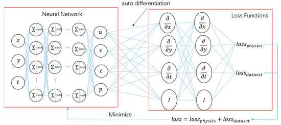 In bridge engineering, we can easily obtain a concentration field by particle tracer methods or optical methods, but the velocity and pressure fields are not easily obtained directly. In this work, the architecture of the PINN for fluid dynamics (shown in Figure 1) is implemented using Pytorch [31] and is used to obtain the velocity and pressure fields from the concentration field. The transport equation of the passive scalar is embedded into this model. We must emphasize that in the model, the concentration field is the only input data and it can be obtained by the flow visualization method, and the velocity and pressure fields are the data we want to obtain through the model; hence, the title of this paper includes Flow Prediction Based on Flow Visualization.