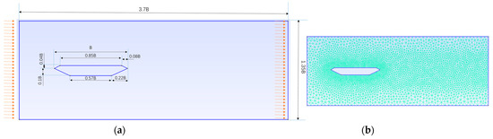 The vortex-induced vibrations of the wind field have the potential to damage bridges, especially long-span bridges [39,40,41]. A typical example is the Humen Bridge in China. Significant vibrations occur in this bridge under the vortex-induced vibration effect. The profile of the bridge deck section has an impact on this effect. Thus, it is necessary to investigate the flow field around the bridge deck section. To examine the effect caused by this wind field, Scanlan et al. [42] studied five generic deck sections, including four block sections and one H-section. As they obtained similar results for all five geometries, only a single geometry is used in the present study. The geometric dimensions considered herein are shown in Figure 2, and the computational domain is shown in Figure 3a.
