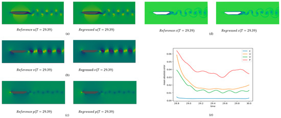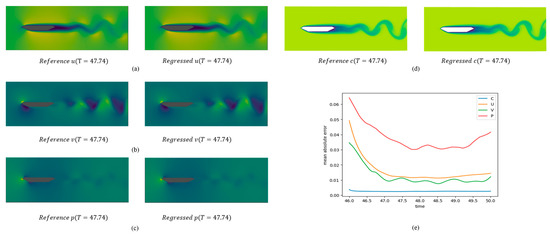 Comparison between predicted data and CFD data for Re = Pe = 1250: (a) u component; (b) v component; (c) p; (d) c; (e) mean absolute error.