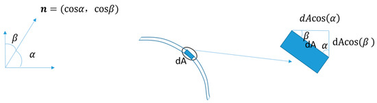 A micro-element on the surface of the geometry is taken for the analysis in the figure, giving the components of the area of the micro-element in the horizontal and vertical directions, where n denotes the unit normal vector in the surface of the geometry; and are the angles between the normal direction and the horizontal and vertical directions, respectively; A denotes the surface geometry.