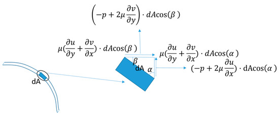 In order to obtain the lift and drag forces, we also need to know the distribution of the total stresses in the horizontal and vertical directions. So, we next label the total stress given by Equation (18), as shown in Figure 9.