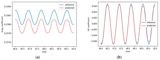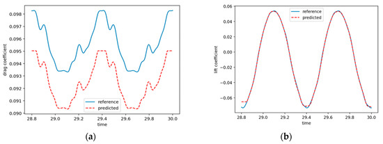 Reference aero force and predicted aero force at Re = 1250: (a) drag coefficient; (b) lift coefficient.