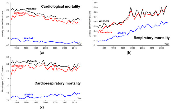 Mortality in Spain: (a) cardiological mortality, (b) respiratory mortality and (c) cardiorespiratory mortality.