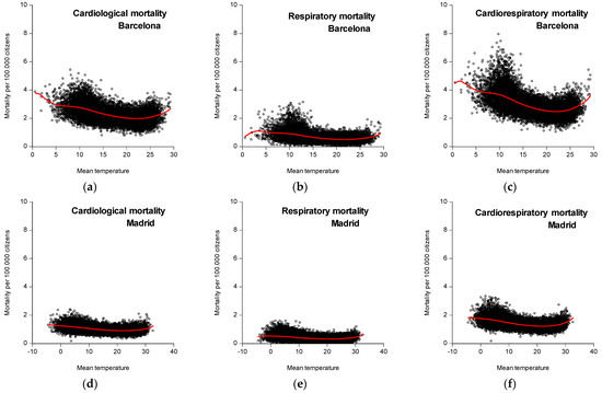 The aim of the present study was to compare two different countries located in the Mediterranean region, i.e., Spain and Greece, and five different cities, i.e., Madrid, Barcelona, Valencia, Attica and Thessaloniki. The reason that Spain and Greece were chosen is because they both belong in the Mediterranean basin, which is characterized as a global climate change hot spot. Hence, the spotlight was turned on them so as to compare countries that are located in a climate change hot spot area but simultaneously have different climatic conditions. The data under examination concern cardiological, respiratory and cardiorespiratory mortality and the mean temperature so as to capture the effect of temperature on mortality. After visual representation of mortality and the mean temperature (i.e., scatter plots), we confirmed that the relationship between temperature and mortality is nonlinear, thus agreeing with the results of the existing literature (see among others [34,35,36,37]). Furthermore, visual representation of mortality shows a downward trend for cardiological and cardiorespiratory mortality and an upward trend for respiratory mortality for Spain, while for Greece, respiratory and cardiorespiratory mortality increase throughout the years, and the trend remains approximately stable for cardiological mortality. Our results agree with the relevant literature since the scatter plots reveal a U-shaped relationship between mortality and temperature implying that temperature affects mortality in a nonlinear way [38,39]. In light of nonlinearity, the temperature percentiles were quantified so as to observe how different percentiles may be defined by different temperature thresholds for the five cities under examination.