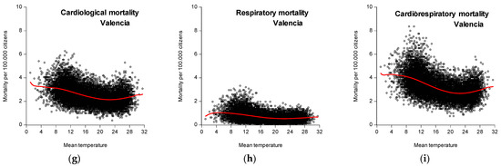 Scatter plots for Spain for all causes of mortality under examination and the mean temperature: (a) cardiological mortality for Barcelona, (b) respiratory mortality for Barcelona, (c) cardiorespiratory mortality for Barcelona, (d) cardiological mortality for Madrid, (e) respiratory mortality for Madrid, (f) cardiorespiratory mortality for Madrid, (g) cardiological mortality for Valencia, (h) respiratory mortality for Valencia, and (i) cardiorespiratory mortality for Valencia.