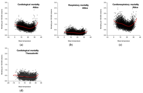 Scatter plots for Greece for all causes of mortality under examination and the mean temperature: (a) cardiological mortality for Attica, (b) respiratory mortality for Attica, (c) cardiorespiratory mortality for Attica, and (d) cardiological mortality for Thessaloniki.