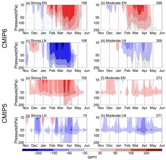 Figure 2 shows the temporal evolution of composite geopotential height anomalies area-averaged over the polar cap (70°–90° N, 0–360°) for different ENSO groups in CMIP6 and CMIP5 models. Clearly, the CMIP6 models can well reproduce the response of the Arctic stratosphere to ENSO; namely, El Niño greatly weakens the stratospheric polar vortex, while La Niña strengthens it (Figure 2a–d). We also see that the stratospheric responses are larger in strong ENSO events (Figure 2a,c) than those in moderate ENSO events (Figure 2b,d), indicating a monotonic increase of ENSO impact with its amplitude. Significant ENSO signals mainly appear from February to April, although the signals can extend to early May in strong El Niño events (Figure 2a), and appear relatively early, in mid-January, in strong La Niña events (Figure 2c). Generally, the CMIP5 models can also reproduce the response of the Arctic stratosphere to ENSO (Figure 2e–h) but with a less significant and much smaller magnitude as compared to CMIP6 models.