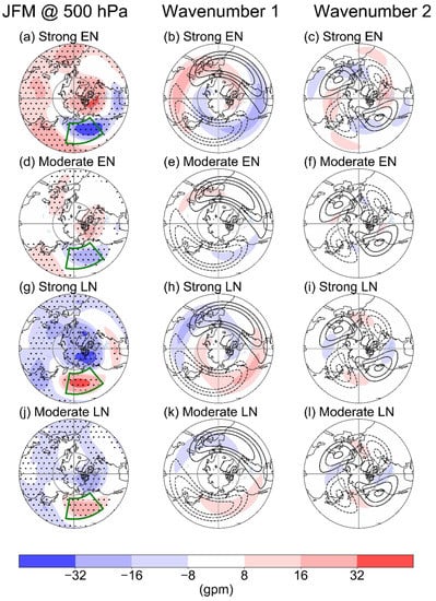 Composite (left panels: a,d,g,j) 500-hPa geopotential height anomalies averaged from January to March and (middle panels: b,e,h,k) the wavenumber 1 and (right panels: c,f,i,l) wavenumber 2 components for different ENSO groups in CMIP6 models. Dotted areas mark the 95% confidence level of the anomalies. Black contours represent the corresponding climatological components at ±25, ±50, and ±75 gpm, respectively. Green boxes outline the region used for defining the Aleutian low strength (see the text for details).