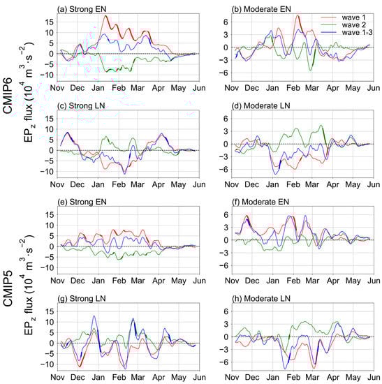 Temporal evolution of composite anomalies of the vertical component of 100-hPa Eliassen–Palm (EPz) flux averaged in 55°–75° N for different ENSO groups in (a–d) CMIP6 and (e–h) CMIP5 models. An 11-day running mean is applied. The thick segments indicate the anomalies significant at the 95% confidence level.