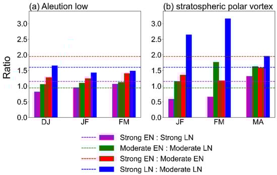 The ratios of (a) the Aleutian low strength and (b) the stratospheric polar vortex strength between two different ENSO groups in CMIP6 models. The dashed lines represent the ratios of winter Niño3.4 SSTa between two different ENSO groups. DJ = December–January, JF = January–February, FM = February–March, MA = March–April.