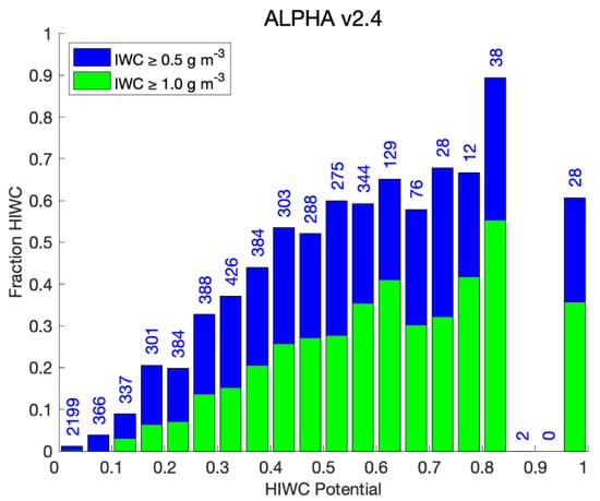 Fraction of airborne IWC measurements that exceed the HIWC threshold of 0.5 g m−3 (blue bars) and 1.0 g m−3 (green bars). Sample sizes for each bin are shown in blue text above the bars. Adapted from H2020.