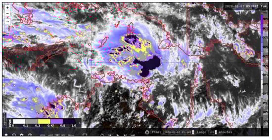 The H8 satellite data is received every 10 min and is pre-processed to generate data files containing observed and derived parameters for ingestion by ALPHA. The spatial resolution of these data is interpolated to 0.02 degrees. A different blend of data fields, fuzzy logic membership functions, and weights are used for daytime and night-time hours (H2020, Table 2 []). The derived satellite parameters were generated using the Geostationary Cloud Algorithm Testbed (GEOCAT) application developed at NOAA NESDIS (http://cimss.ssec.wisc.edu/csppgeo/geocat.html, accessed on 15 April 2023) which is a software framework for running science algorithms. The derived parameters used in ALPHA included cloud top temperature (CTT) and cloud top height (CTH) [], as well as daytime cloud optical depth (COD) []. The COD field has significant spatial variability at small scales and is spatially averaged within ALPHA using a 10 km × 10 km window prior to processing by the fuzzy logic.