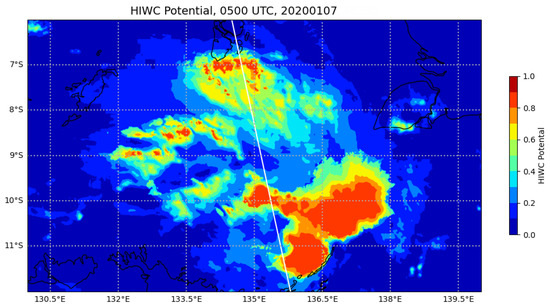 HIWC product from 0500 UTC, 7 January 2020 H8 scan (local scan time at 9° S centred around 05:05:30 UTC). White line shows the CloudSat track across the sector and this is centred at 05:00:12 UTC at 9° S.