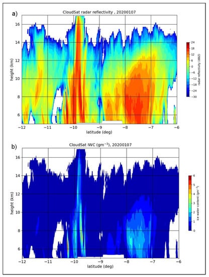 Vertical cross section above the freezing level (5 km) from CloudSat of (a) radar reflectivity and (b) retrieved IWC. Cross section is centred at 05:00:12 UTC, 7 January 2020, at 9° S.