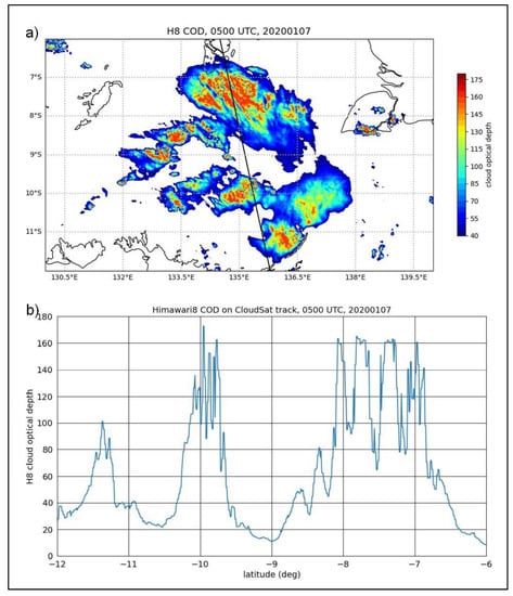 (a) Cloud optical depth (COD) field retrieved from Himawari-8 data for 0500 UTC, 7 January 2020. Overlaid track is 0.05 deg west of the recorded CloudSat track (see text). (b) Cross section of COD retrieved from 0500 UTC H8 data on track shown in (a).