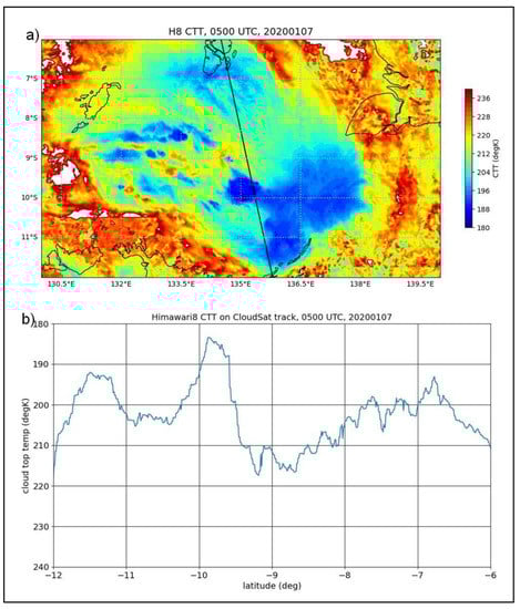 Cloud top temperature retrieved from 0500 UTC H8 scan with track overlaid 0.05 deg west of the CloudSat track (see text). (b) Cross section of cloud top temperature retrieved from 0500 UTC H8 scan on track shown in (a).