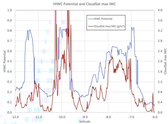 HIWC Potential from ALPHA (blue, left axis) on track 0.05 deg west of CloudSat track (see text) and column maximum IWC from CloudSat (red, right axis) data as a function of latitude.