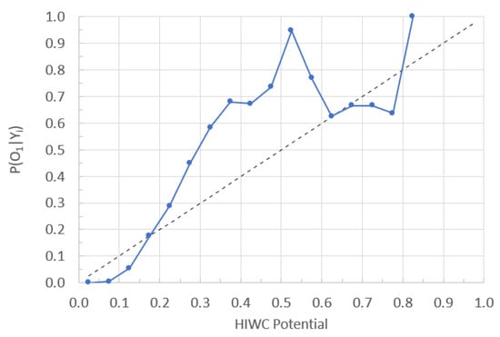 Reliability diagram showing the probability that maxIWC ≥ 1.0 g m−3 for a given HIWC Potential [P(O1|Yi)], plotted as a function of the HIWC Potential [Yi]. For a well-calibrated forecast, the data points would lie along the diagonal shown by the dashed line.
