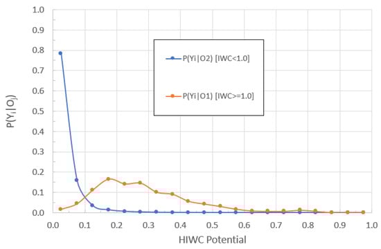 Discrimination diagram showing the conditional probability of HIWC Potential for cases where maxIWC ≥ 1.0 g m−3 [P(Yi|O1)] and cases where maxIWC < 1.0 g m−3 [P(Yi|O2)] as a function of the HIWC Potential. The unconditional probability of HIWC events is P(O1) = 0.017, and for null events it is P(O2) = 0.983 (see text).