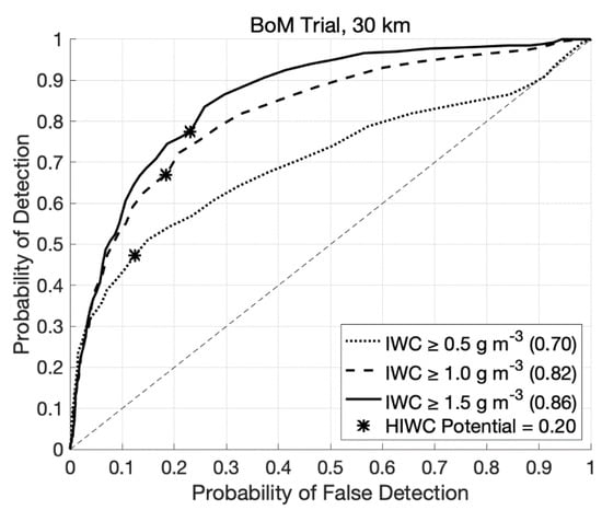 Following H2020, relative operating characteristic (ROC) curves were generated from these data for three IWC thresholds, namely 0.5, 1.0, and 1.5 g m−3. For each IWC threshold, this was carried out by varying the threshold value of HIWC Potential that defines the likely presence of HIWC and calculating the probability of detection (POD) and probability of false detection (POFD) for the retrieved IWC [,]. Figure 12 shows the POD as a function of POFD for each of the IWC thresholds, namely 0.5, 1.0, and 1.5 g m−3, and the associated performance metric, “area under the curve (AUC)” (0.70, 0.82, and 0.86, respectively).