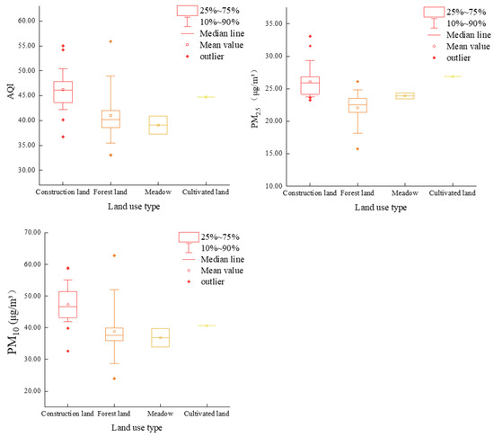 Figure 2 presents the annual mean values of the AQI, PM2.5 concentration and PM10 concentration at each station under four land use/cover types. It can be seen that the land use/cover types ranked from the highest to lowest AQI were construction land (46.19), cultivated land (44.74), forest land (41.01) and grassland (39.05). The land use/cover types ranked by the PM2.5 concentration in descending order were cultivated land (26.87 μg m−3), construction land (26.07 μg m−3), grassland (23.93 μg m−3) and forest land (22.07 μg m−3). For the PM10 concentration ranked in descending order, the order was construction land (47.35 μg m−3), cultivated land (40.62 μg m−3), forest land (38.79 μg m−3) and grassland (36.86 μg m−3).
