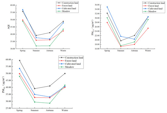 The seasonal variations in the AQI, PM2.5 concentration and PM10 concentration for each type of land use/cover and landscape were analyzed and are shown in Figure 3. The AQI, PM2.5 concentration and PM10 concentration showed similar trends of being high in the spring and winter and low in the summer and autumn under all the types of land use/cover and landscapes, but their seasonal variations under different landscape types were different. The AQI values in construction land were higher than those in the other land use/cover and landscape types except for cultivated land in the spring. The AQI values in grassland were higher than those in forest land in the winter. However, the AQI values in grassland were the lowest in the other three seasons and obviously lower than those in the other land types in the summer and autumn. The lowest AQI value could be found in forest land in the winter. The PM2.5 concentration in forest land was the lowest in all seasons, while in cultivated land it was the highest in the spring and summer, and in construction land it was the highest in the autumn and winter. The PM10 concentration in construction land was remarkably higher than in the other types of land use/cover and landscapes in all seasons. The PM10 concentration in grassland was the lowest except for in winter. In winter, it was the lowest in forest land, followed by cultivated land.