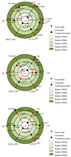 The PM10 concentration was significantly correlated with the ED (p < 0.01) and AREA_MN (p < 0.01) of construction land in the buffer zone with the 1000 m radius, and it was also significantly correlated with the LPI (p < 0.05) and AREA_MN (p < 0.05) of grassland within the 2000 m radius. For the radius of 3000 m, the PM10 concentration was significantly correlated with the PLAND (p < 0.01) of forest land and the PD (p < 0.05) and NP (p < 0.05) of construction land. In the buffer zone with the 4000 m radius, the PM10 concentration was correlated with the PLAND (p < 0.01), ED (p < 0.01) and AREA_MN (p < 0.01) of forest land and the LPI (p < 0.01) of construction land. Within the 5000 m radius, the PM10 concentration had correlations with the LPI (p < 0.01), PD (p < 0.05) and NP (p < 0.05) of forest land, the ED (p < 0.01), PD (p < 0.01) and NP (p < 0.01) of grassland, and the PLAND (p < 0.01) and ED (p < 0.01) of construction land.