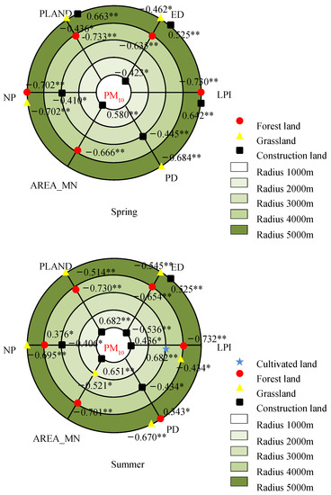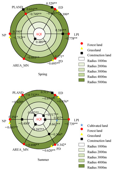 In the spring, the LPI of forest land had the most obvious influence on the AQI in the buffer zone with the 5000 m radius, and the correlation coefficient was −0.778. The LPI of forest land and the NP of grassland had the most significant correlations with the PM2.5 concentration within the 5000 m radius, with identical coefficients of −0.684. Within the radius of 4000 m, the PLAND of forest land had remarkable effects on the PM10 concentration, with a correlation coefficient of −0.733.