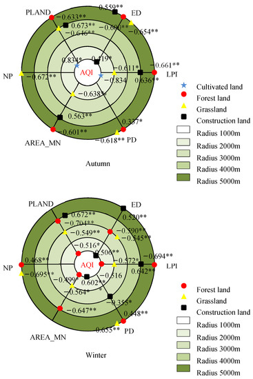The correlations with the seasonal air pollutant concentrations suggest that all landscape metrics of forest land were significantly correlated with air pollutant concentrations in the four different seasons, while some landscape metrics of cultivated land, construction land and grassland were not correlated with them. Except for autumn, the landscape metrics of forest land showed the most significant negative correlation with the AQI, PM2.5 concentration and PM10 concentration in all seasons. However, the landscape metrics of cultivated land had strong negative correlations with the AQI value and PM2.5 concentration in autumn. The positive correlations of the landscape metrics of construction land with the PM10 concentration were also significant in autumn and winter.
