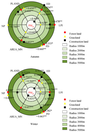 Correlations of the landscape metrics with seasonal mean PM10 concentration in the different buffer zones. * and ** indicate the statistical significance level of 0.05 and 0.01, respectively.