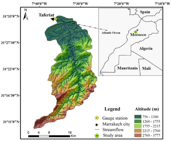 The study area is the Zat catchment, a tributary of the Tensift river basin. It is located in the South EST of Marrakech city with latitudes 31°30 and 31°45 north and longitudes 7°30 and 7°45 west, as shown in Figure 1. With elevations ranging from 756 to 3777 m and a surface of 521 km2 [7], while the annual precipitation average is 395 mm, of which 30% is snow at altitudes above 2000 m [48,49], the climate is intermediate between semiarid and humid in the upstream, semi-arid in the downstream, and greatly impacted by altitude [50]. The Zat catchment is characterized by a complex river network, recognized by a dense and complicated hydrographic network. A river drains the Zat Basin and connects with the Ourika River to form the Hadjar River’s two main tributaries. The upstream geology is defined by the outcrop of Precambrian terminal igneous and metamorphic rocks and is considered impermeable. While the downstream is in the northern sub-Atlantic zone, the principal outcrops are from the post-Hercynian layer mostly permeable [51]. At the highest elevations, the slope’s average is 19% [52]. These environmental conditions encourage the creation of runoff. The vegetation is divided into two sections: the forests in the mountain area upstream and the agricultural section downstream, which includes cultivated land along the river channel.