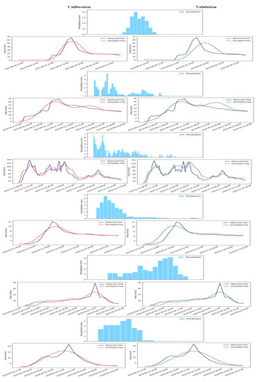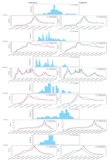 Calibration process: A total of 24 events were simulated and calibrated using the initial values. However, the calibration was developed by maintaining the maximum and minimum ranges of the calibration parameters based on the literature [7,15]. The averages of these intervals were considered as initial values in the case of this paper. These values were manually adjusted to obtain a good fit within the observed and estimated flows. The quality of the adjustment was judged using the visualization of the hydrographs and the calculated statistical values. However, a critical analysis was applied to ensure that the input parameter values used are physically meaningful by evaluating the watershed and stream characteristics.